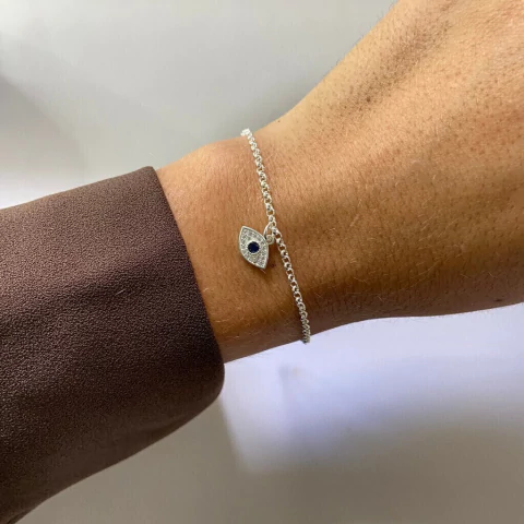Pulseira em elos português com pingente de olho grego com zircônias, banhada em prata 925