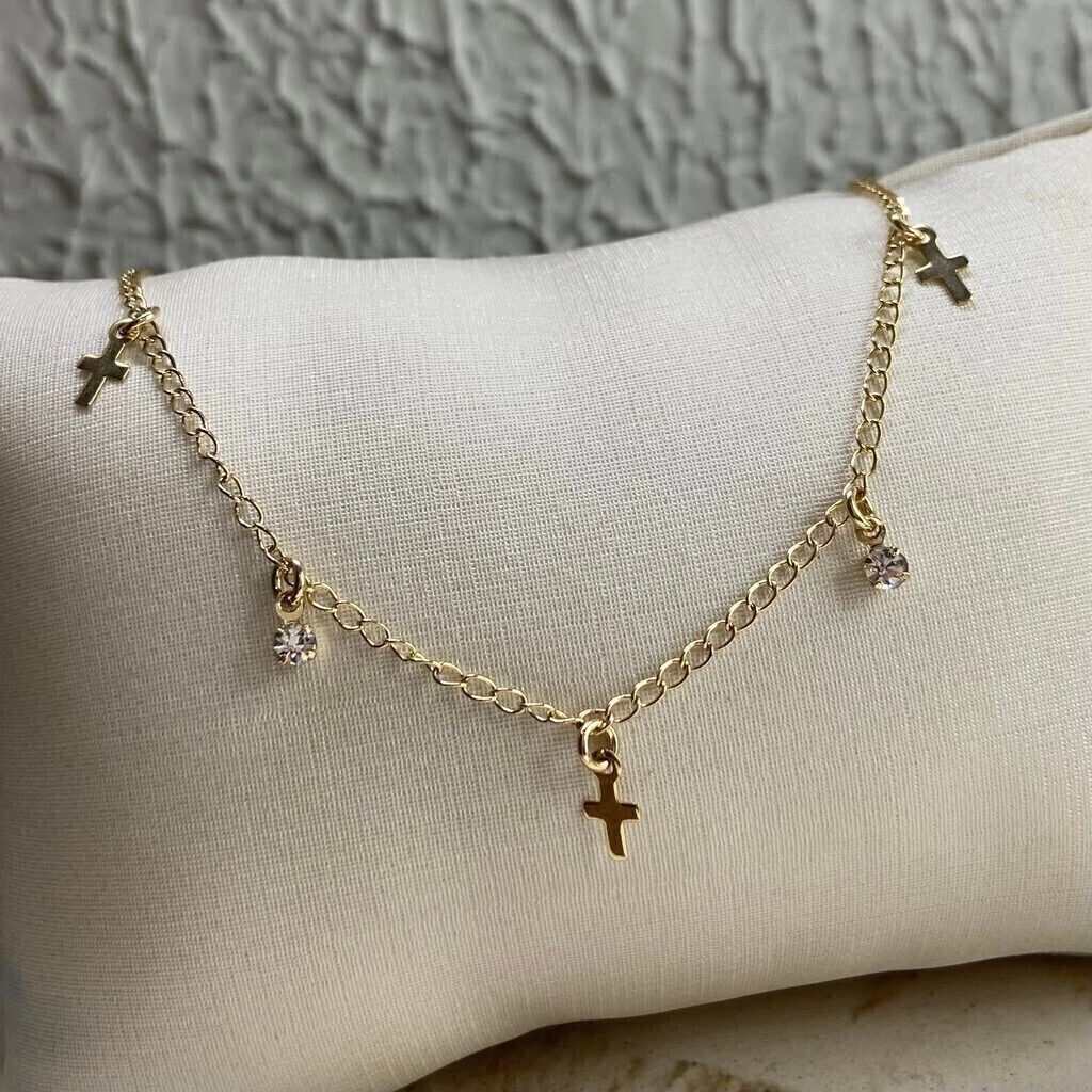 Tornozeleira crucifixo e espirito santo semijoia ouro